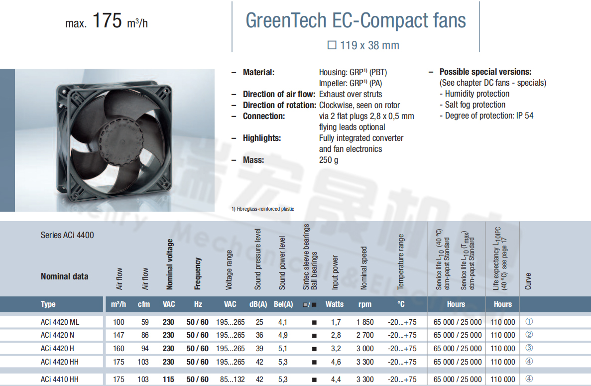 Aci4420HH風(fēng)量:175m³/h 電壓:230v 電流:5.3A 功率:4.6W 轉(zhuǎn)速:3300r/min